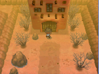 在火山左边的城市,右边有个破房子(鬼屋哦)