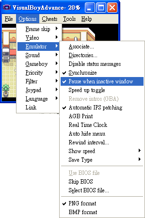 5. 再把两个仿真器的这两个勾取消,否则联机会失败! 取消菜单Options→Emulator→Pause when inactive window前方的勾。