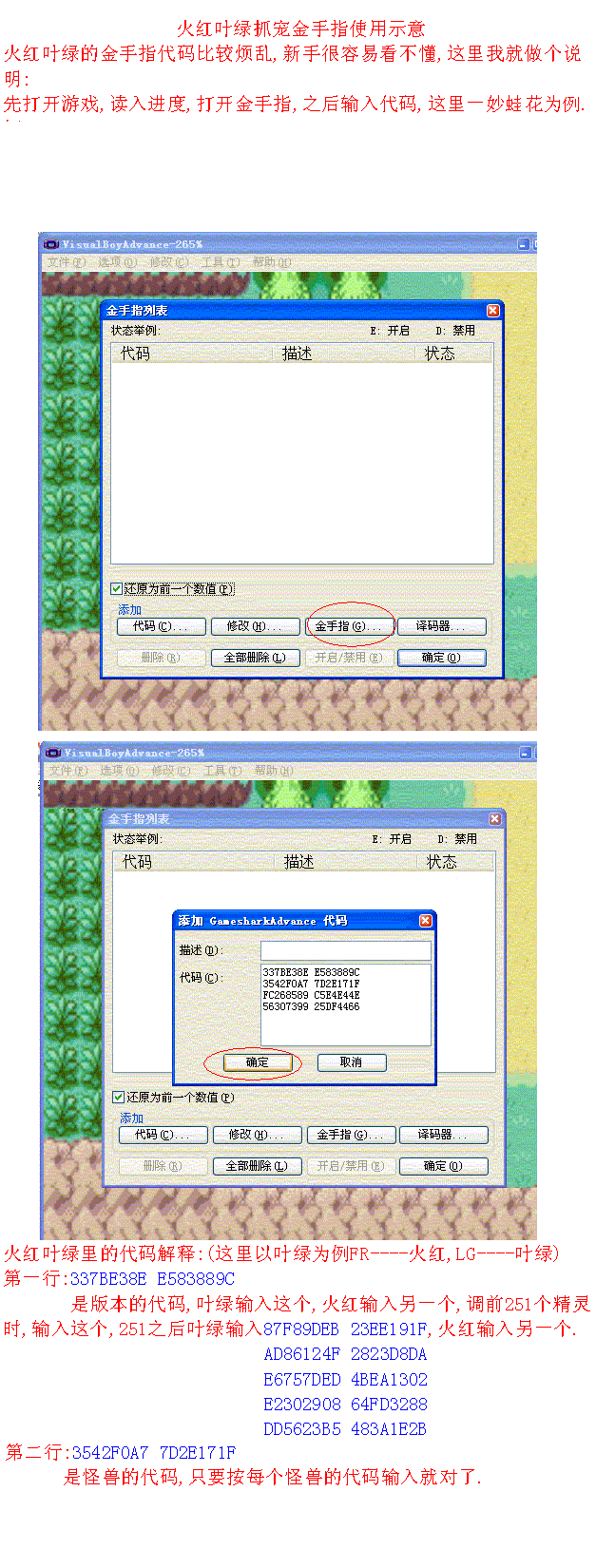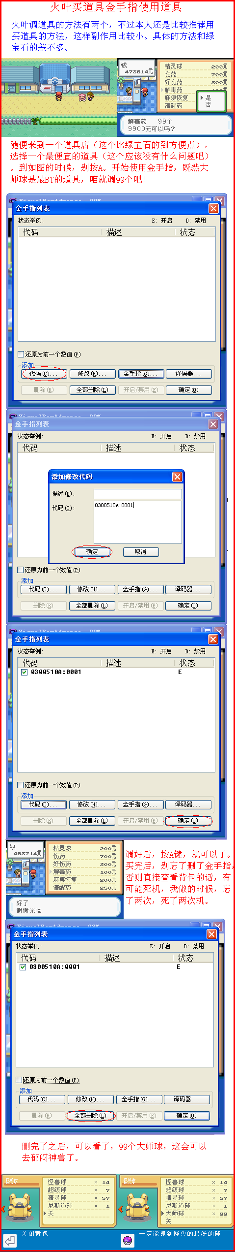 火叶金手指使用教程代码来源:<火叶绝全金手指>还有怪兽金!:http://www.koudai8.com/newbbs/vi ... &extra=page%3D2第一个:火红叶绿抓宠金手指用法示意(附件1--2) 第二个:火红叶绿抓宠金手指用法示意(251以后使用)(附件3--4) 第三个:火红叶绿瞬间移动金手指使用示意(附件5--6)第四个:火红叶绿买道具金手指用法示意(附件7)第五个:火红叶绿闪光金手指用法示意(附件8)